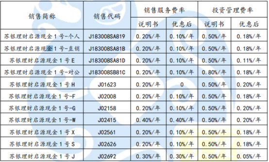 管理人自 2023年10月9日起,對(duì)“蘇銀理財(cái)啟源融匯現(xiàn)金1號(hào)”理財(cái)產(chǎn)品的銷售服務(wù)費(fèi)、投資管理費(fèi)給予優(yōu)惠,具體安排如下: